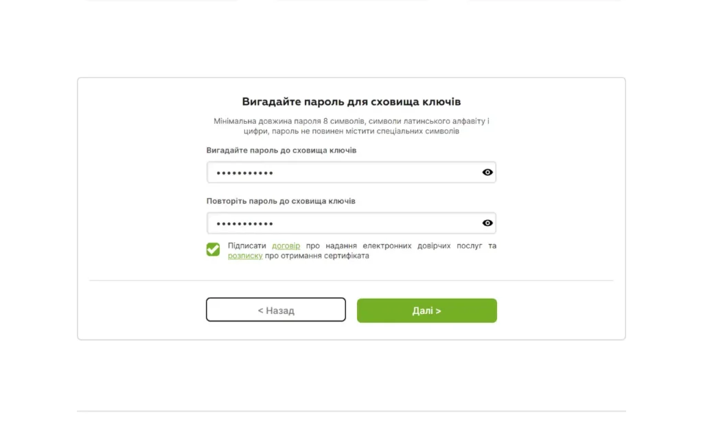 Вигадайте пароль завдовжки не менше 8 символів, який складається з латинських літер та цифр (без спеціальних символів). Запишіть його та зберігайте у безпечному місці. Цей пароль знадобиться вам для подальшого підписання документів.