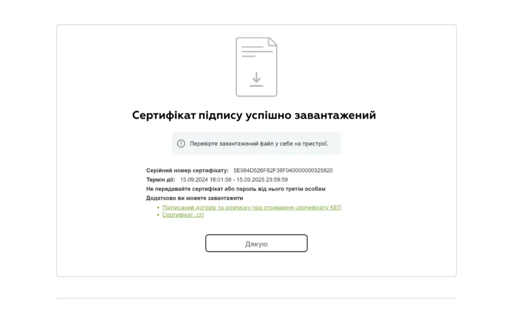 Поверніться на сайт, де у браузері вашого комп’ютера з’явиться повідомлення про завантаження файлу сертифіката. Сертифікат має такий вигляд: pb_1234567890, де цифри — це ваш ідентифікаційний (податковий) номер. Строк дії сертифіката складає один рік.