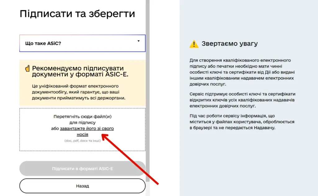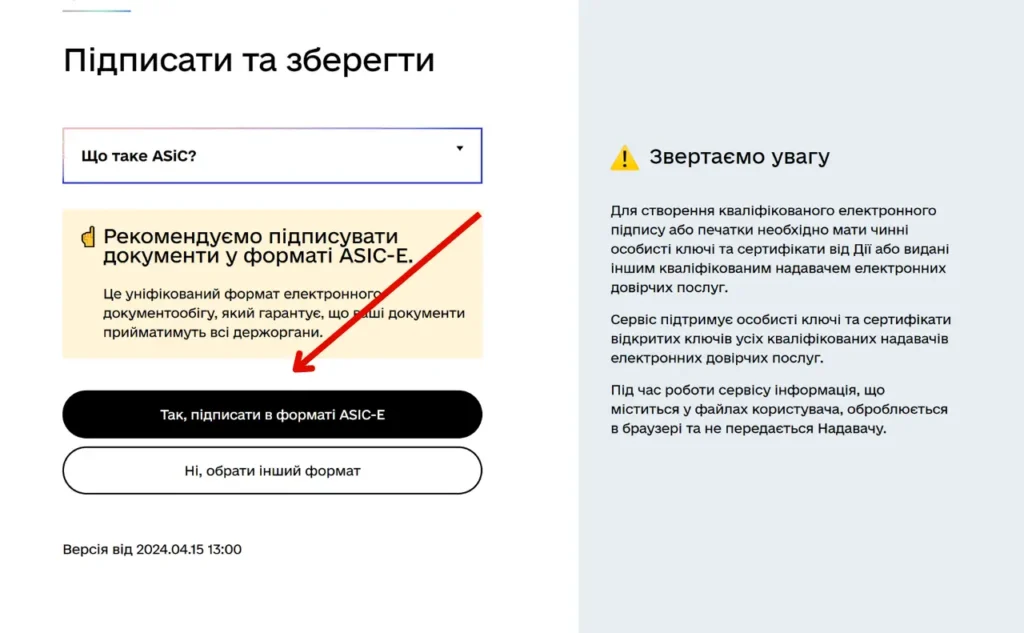 4. Натисніть «Далі → Так, підписати в форматі ASIC-E».
