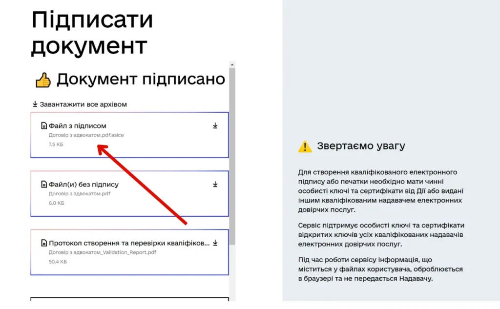 6. Натисніть кнопку «Підписати» та завантажте на комп’ютер перший зі списку файл з підписом у форматі .asice. Цей файл містить підписаний вами документ, який можна зберегти та відправити одержувачу.